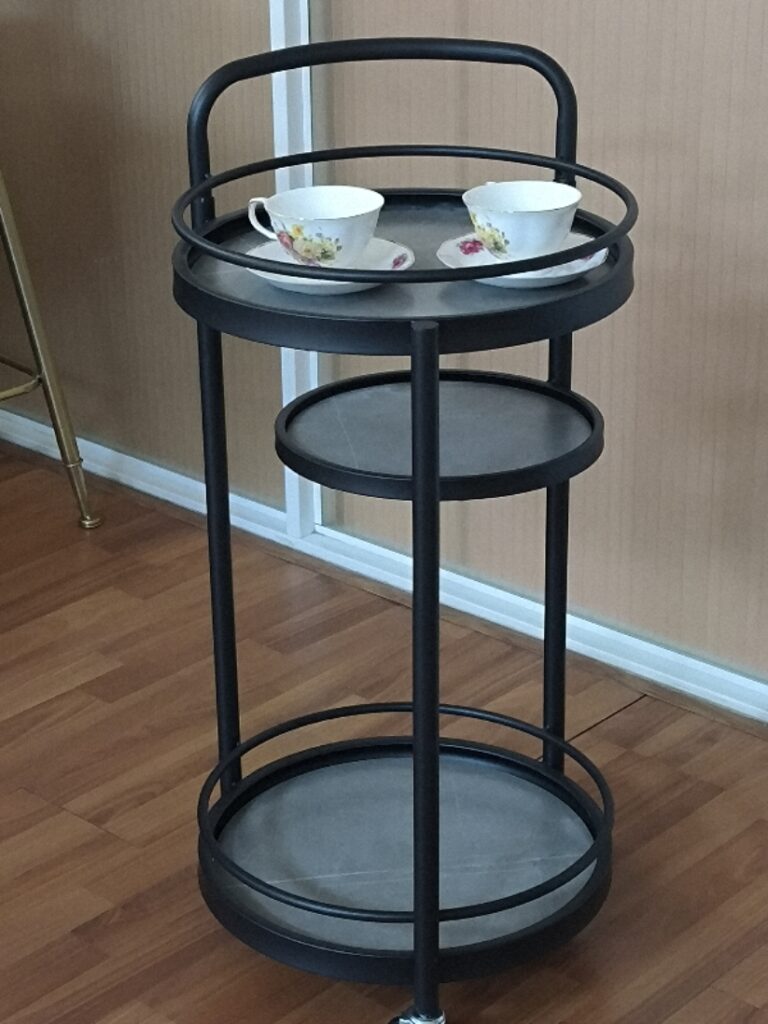I have never been so satisfied with the furniture I bought online. I had only seen this piece of furniture online before. We put it beside the breakfast table to hold pottery, baskets, books and so on. At parties, it can also be conveniently used as a bar counter or a tableware rack, pushed from the kitchen to any party venue. It has a beautiful appearance, is sturdy and durable, and rolls very smoothly. Highly recommended!